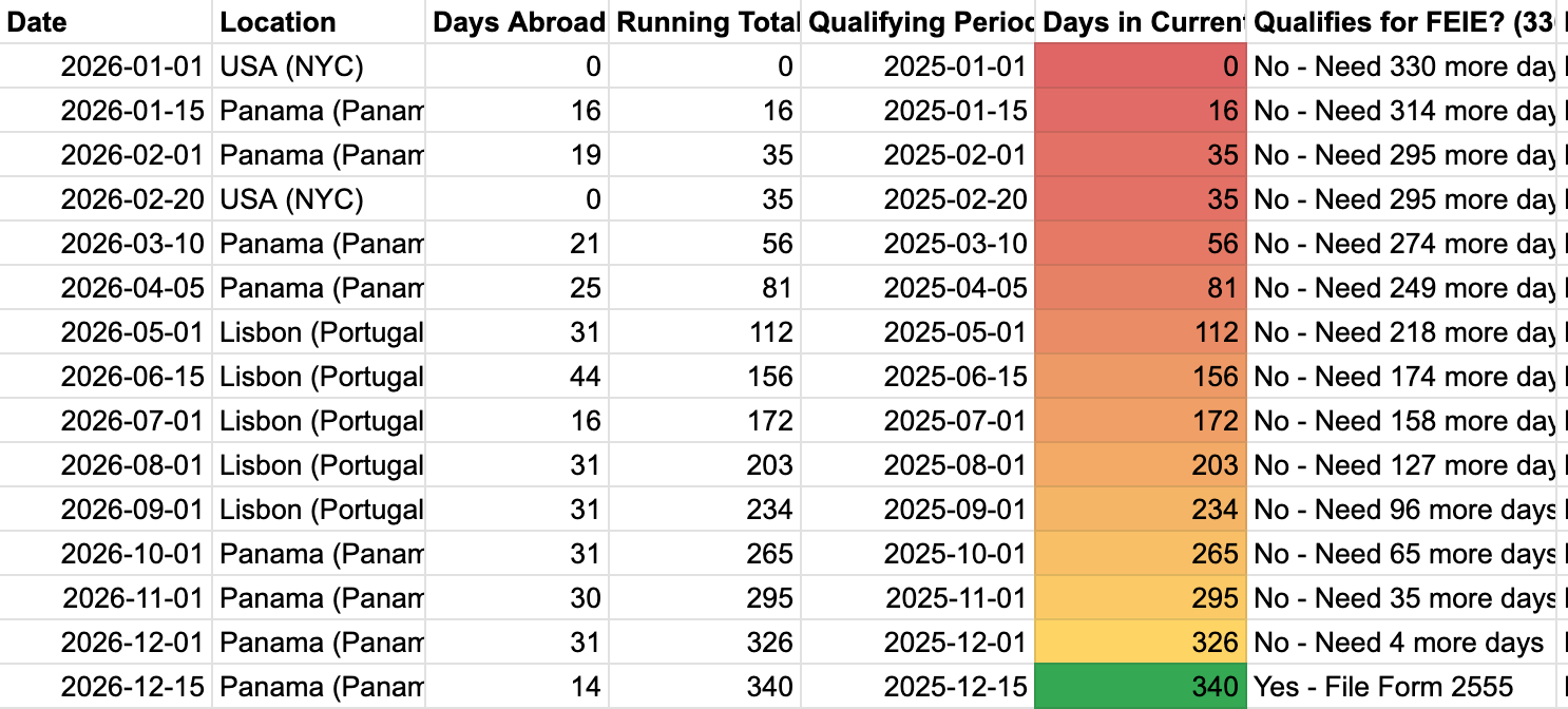 Use this Google Sheet to see how you can hit FEIE within 12 months! It tracks YTD for overview, rolling windows for multiple qualifying periods (IRS allows overlaps), and actionable tips.