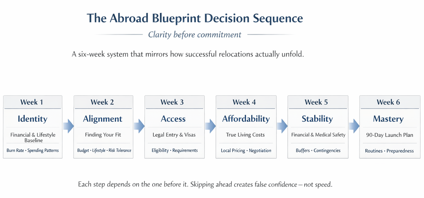 It’s a structured sequence that helps you determine whether relocating abroad is realistic for you — and if so, exactly what needs to happen first.